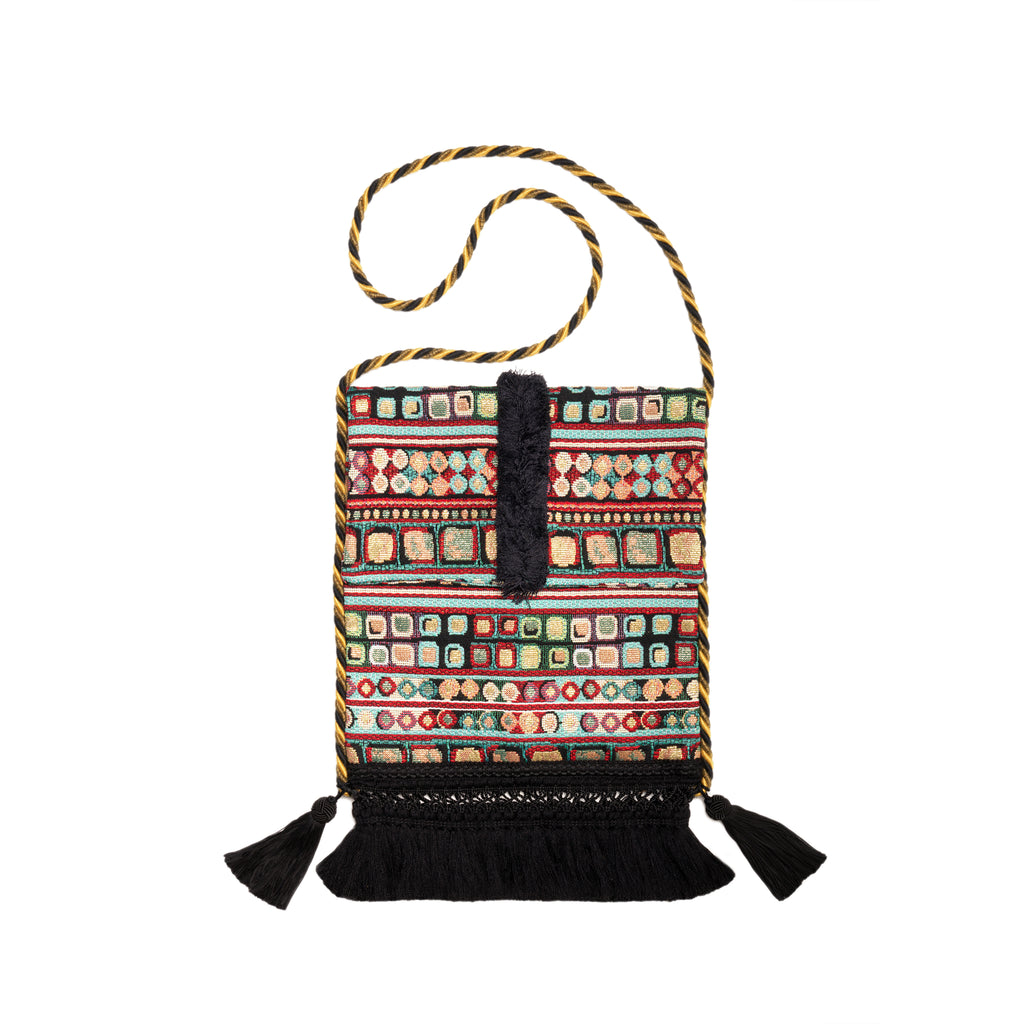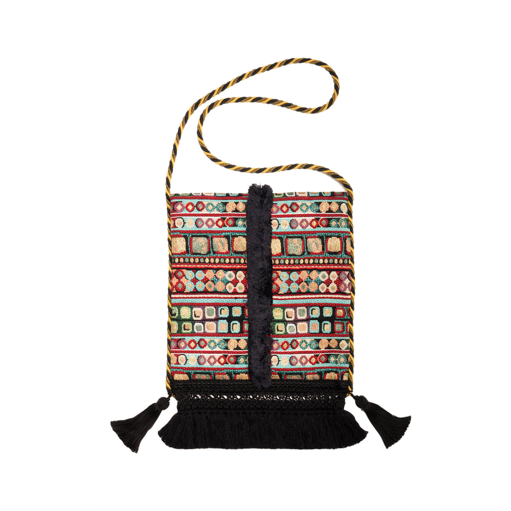 Shoulder Bag with Flap in lamè jacquard, with fringe, colourful tassels and center soft piled fringe. Internal lining in trimmed precious fabric with two pockets