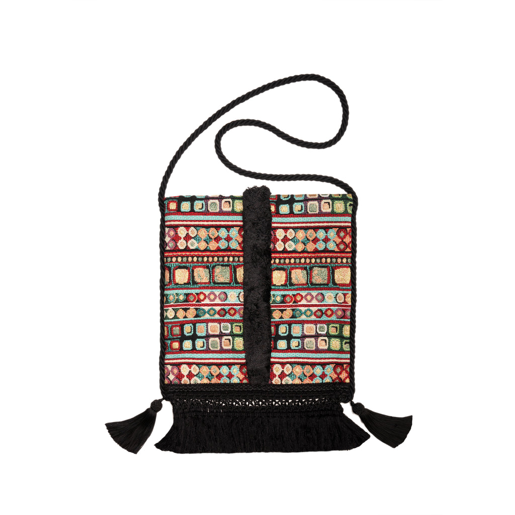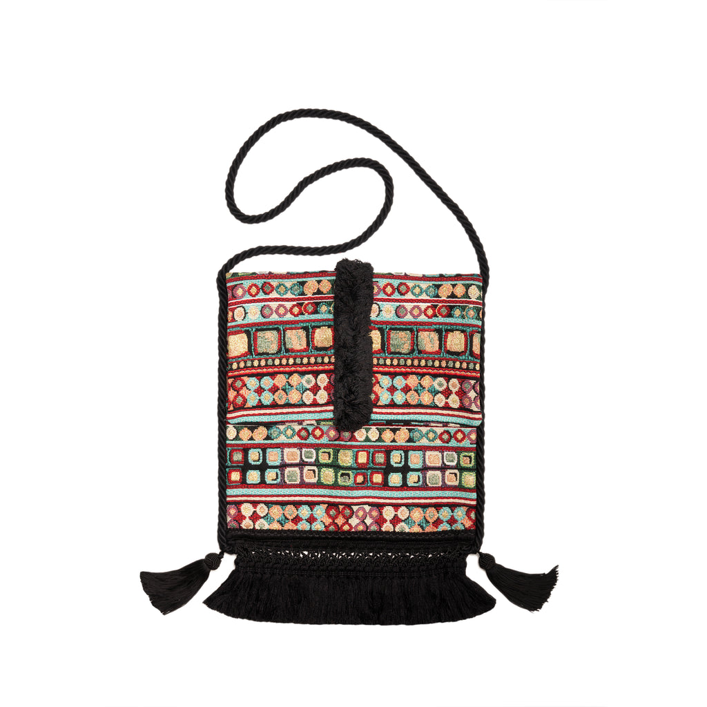 Shoulder Bag with Flap in lamè  jacquard, with fringe, colourful tassels and center soft piled fringe. Internal lining in trimmed precious fabric with two pockets
