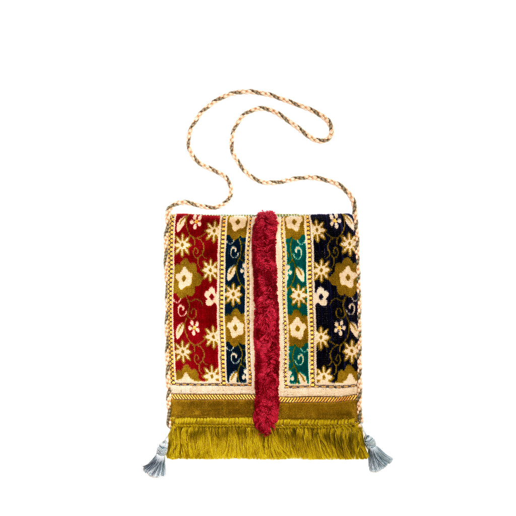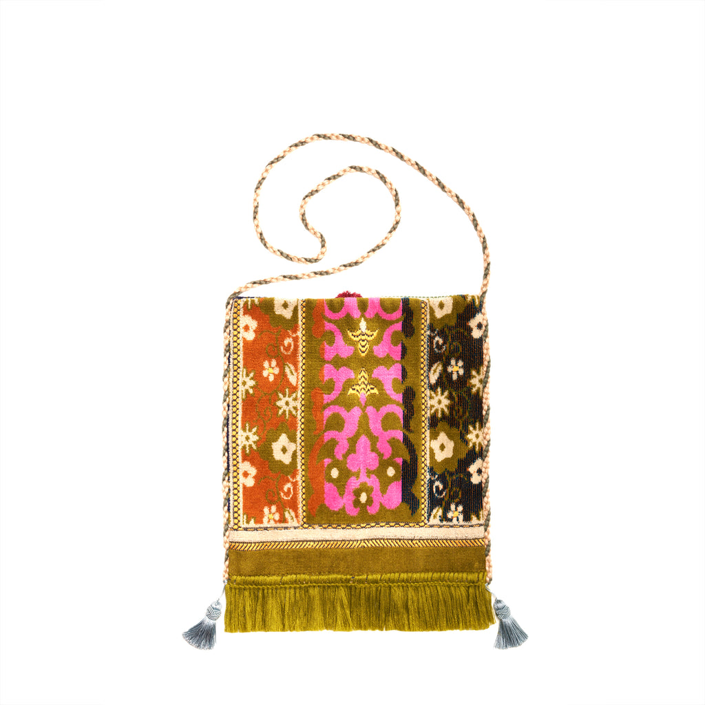 Shoulder Bag in velvet jacquard with fringe, colorful tassels and center soft piled fringe. Internal lining in trimmed precious fabric with two pockets