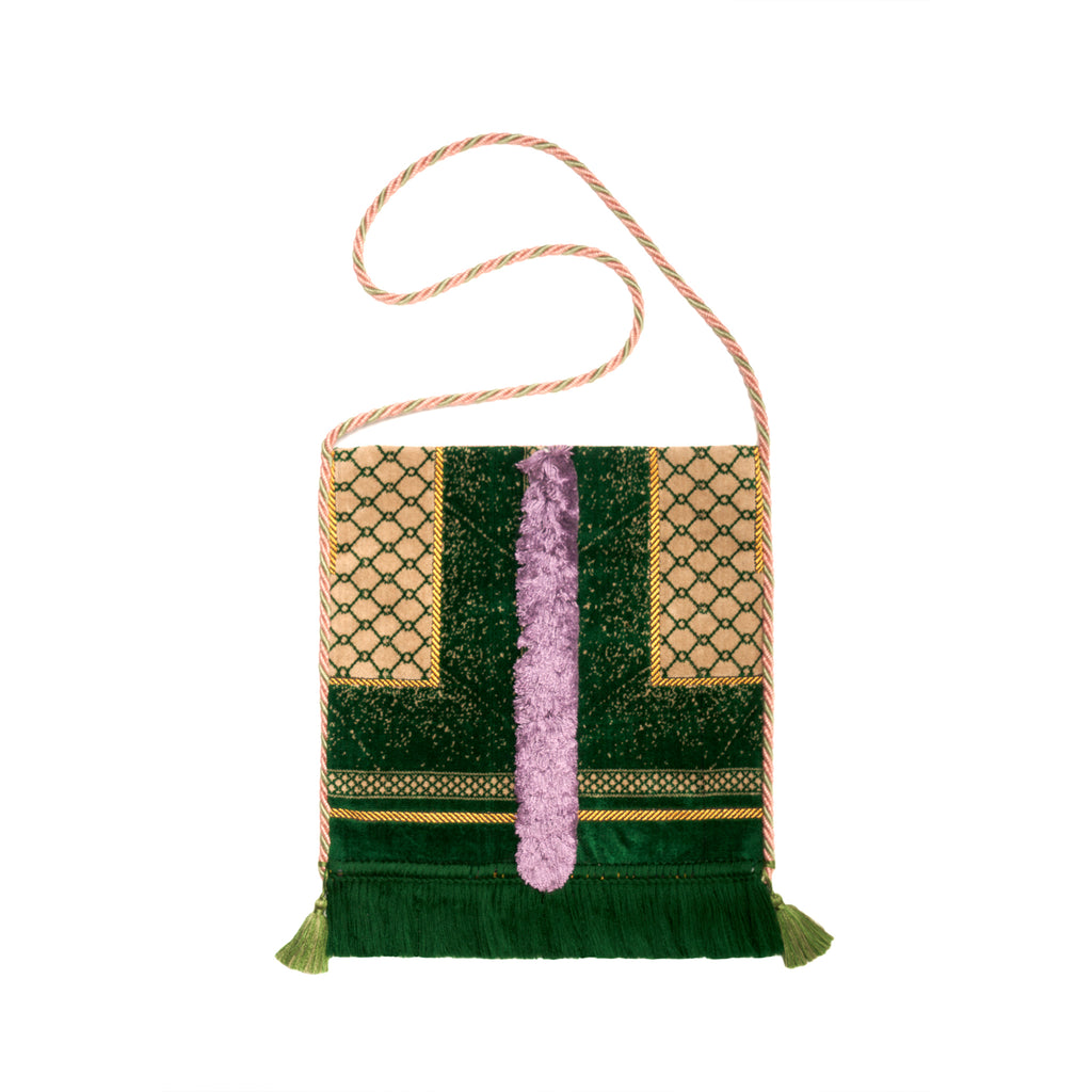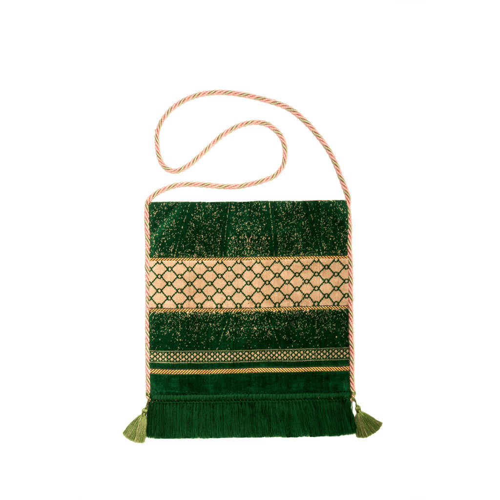 Shoulder Bag in velvet jacquard with fringe, colorful tassels and center soft piled fringe. Internal lining in trimmed precious fabric with two pockets