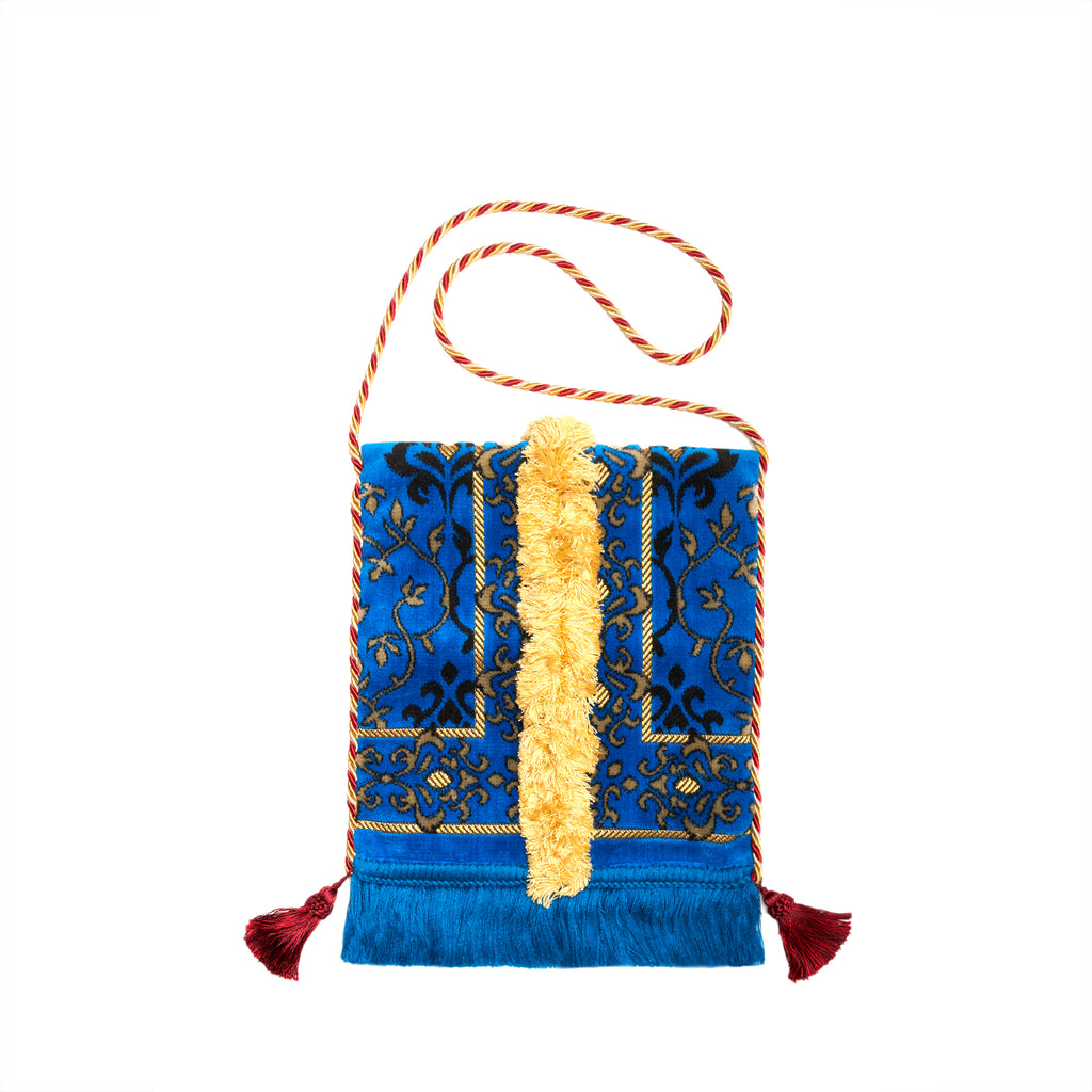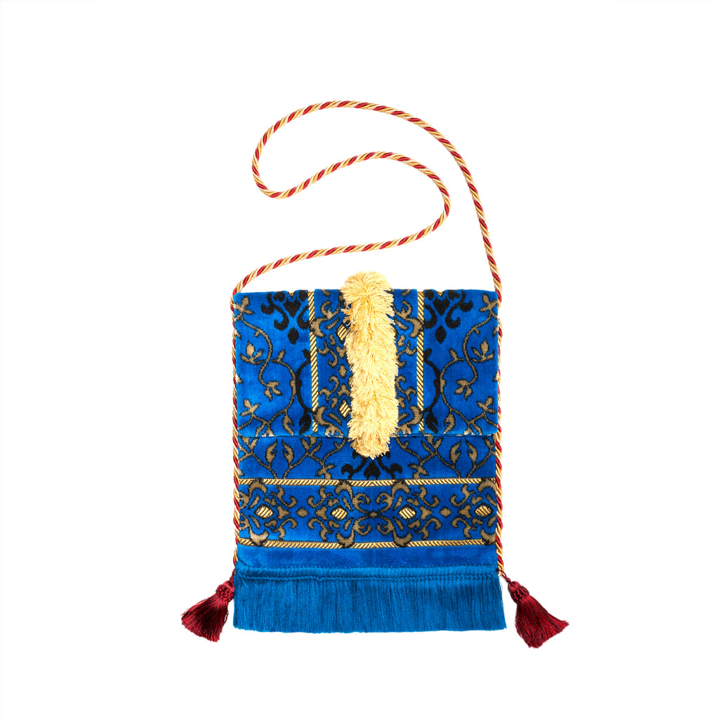 Shoulder Bag with Flap in velvet jacquard, with fringe, colourful tassels and center soft piled fringe. Internal lining in trimmed precious fabric with two pockets