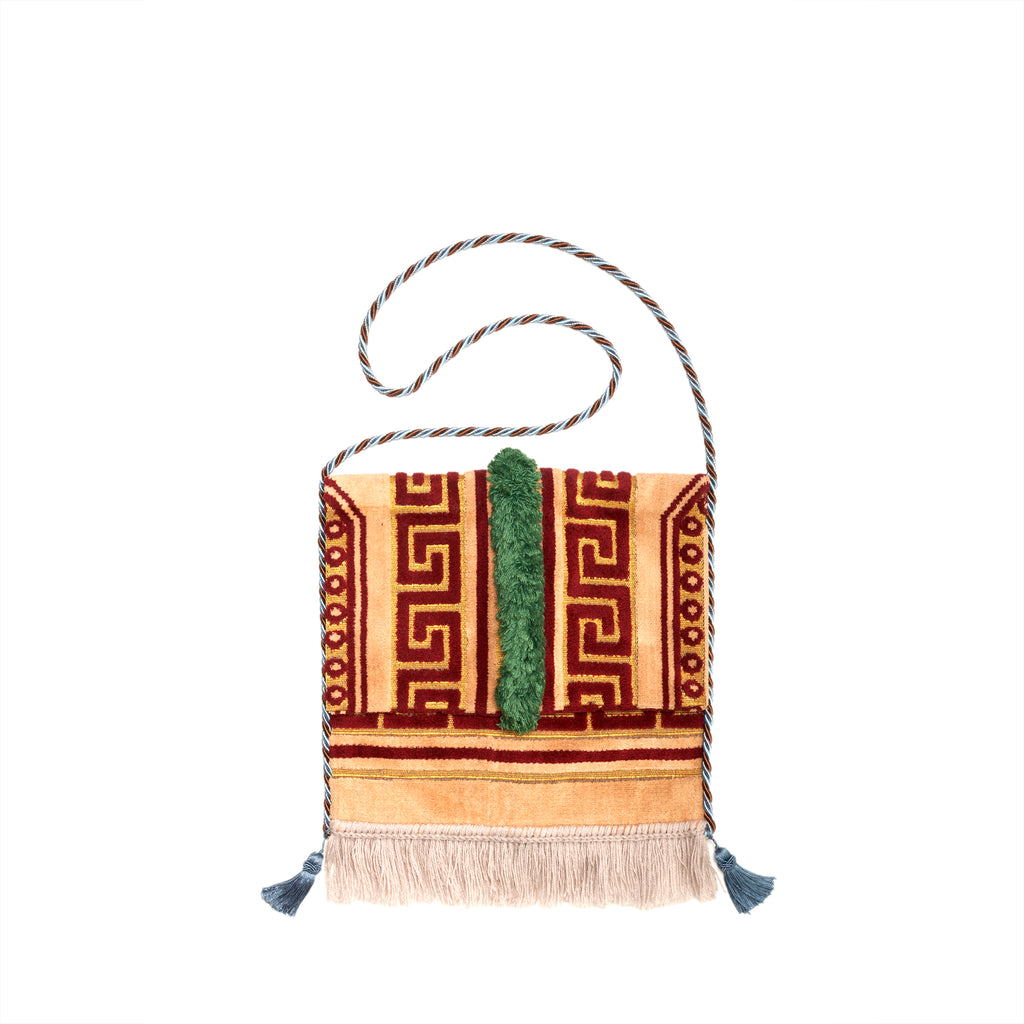 Shoulder Bag with Flap in velvet jacquard, with fringe, colourful tassels and center soft piled fringe. Internal lining in trimmed precious fabric with two pockets