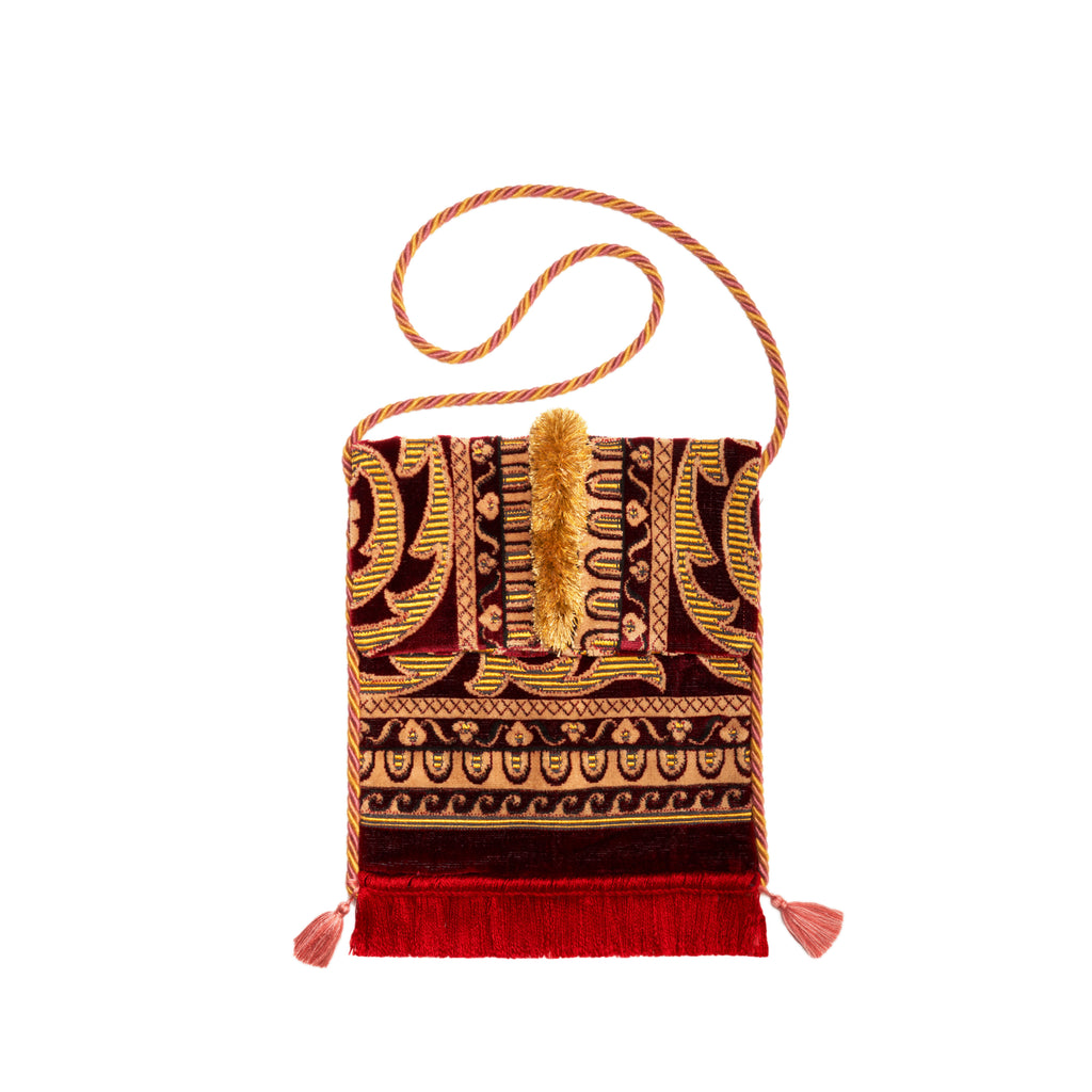 Shoulder Bag with Flap in velvet jacquard, with fringe, colourful tassels and center soft piled fringe. Internal lining in trimmed precious fabric with two pockets